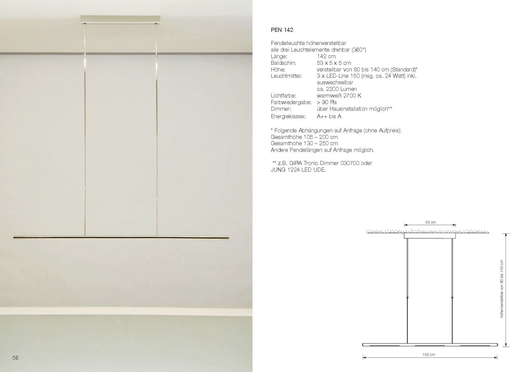 Das Licht kann durch einen Dimmer (z.B. GIRA Tronic 030700) geregelt werden.