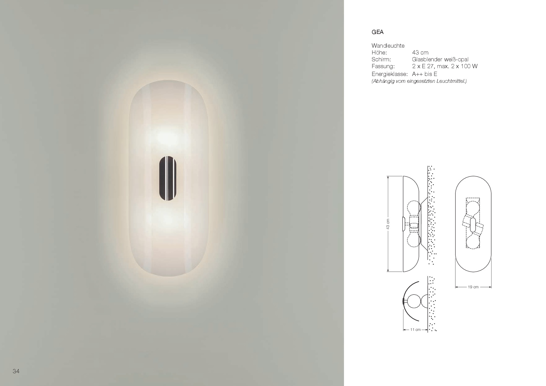 Die Wandleuchte GEA von VS Manufaktur hat einen opal weißen Glasblender als Schirm und ist dadurch sehr gut als