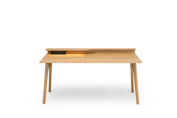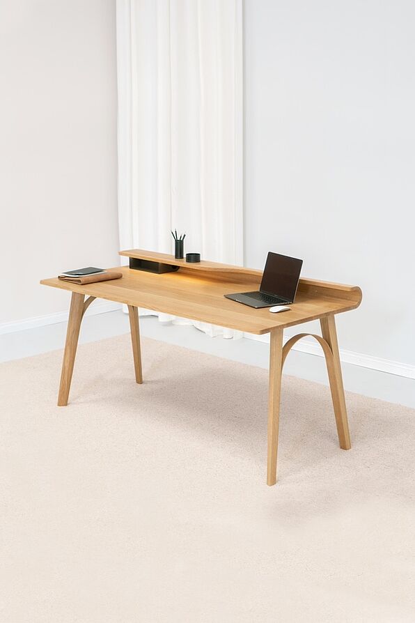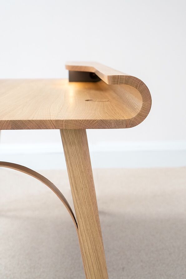 Massivholzflächen werden in fließende Bögen geformt und leicht abgeschrägte Kanten an der Tischplatte unterstreichen strenge