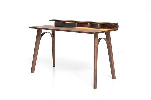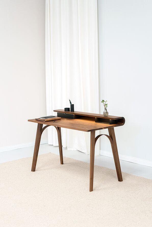 Mit dem Schreibtisch „Arkus“ hat Rodam einen Klassiker für diesen Zweck geschaffen, der nicht nur ins Arbeitszimmer paßt,