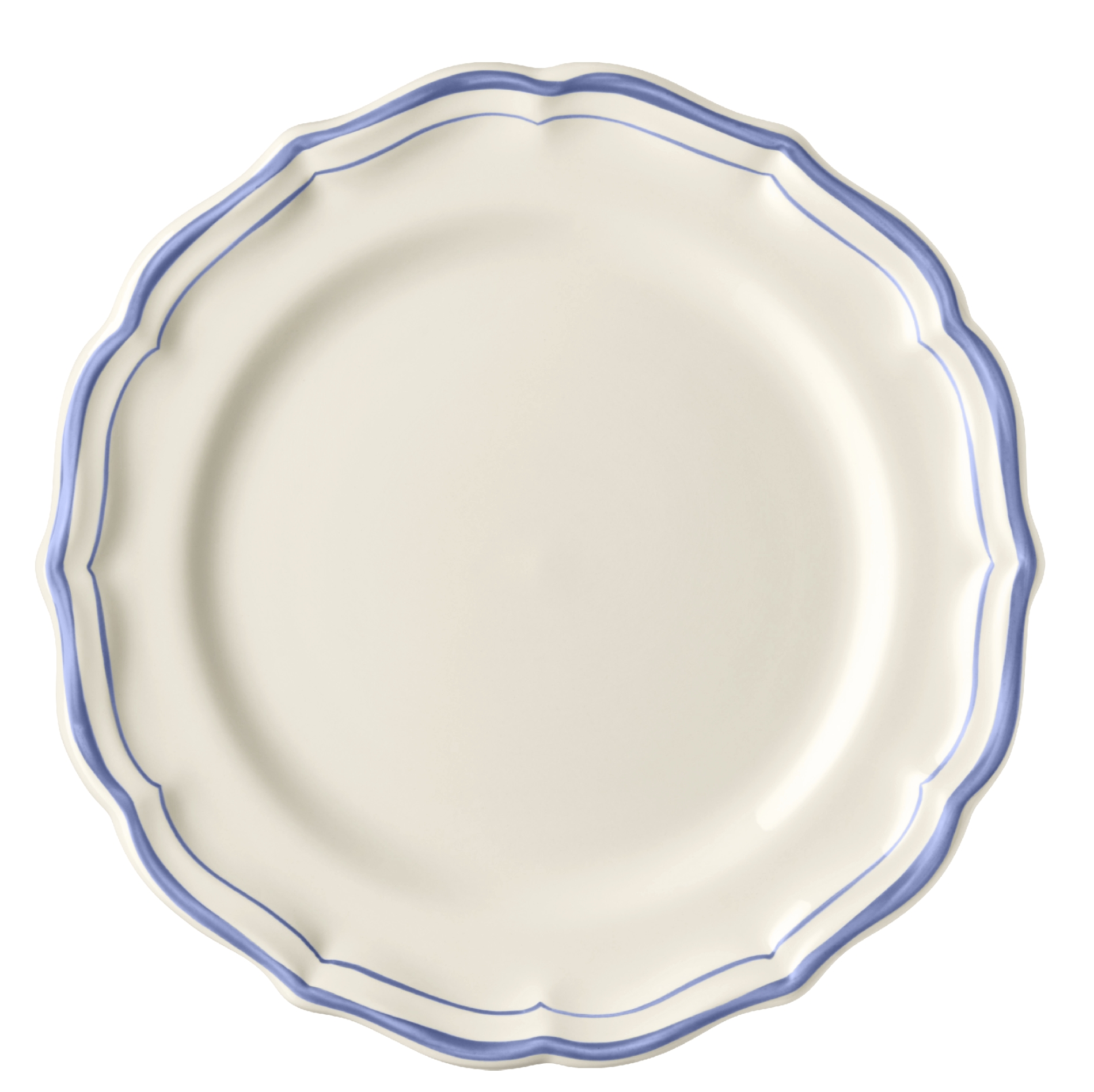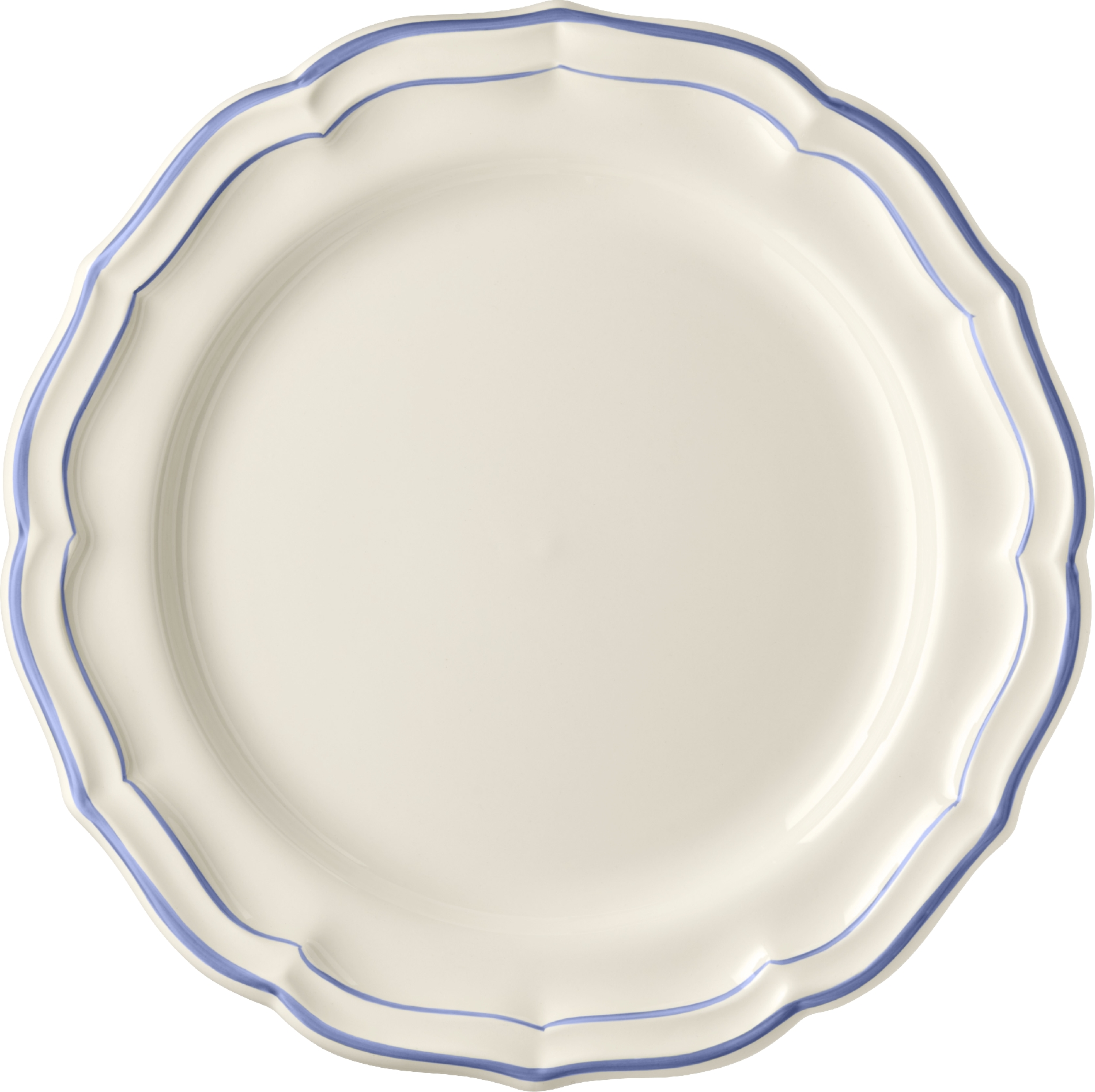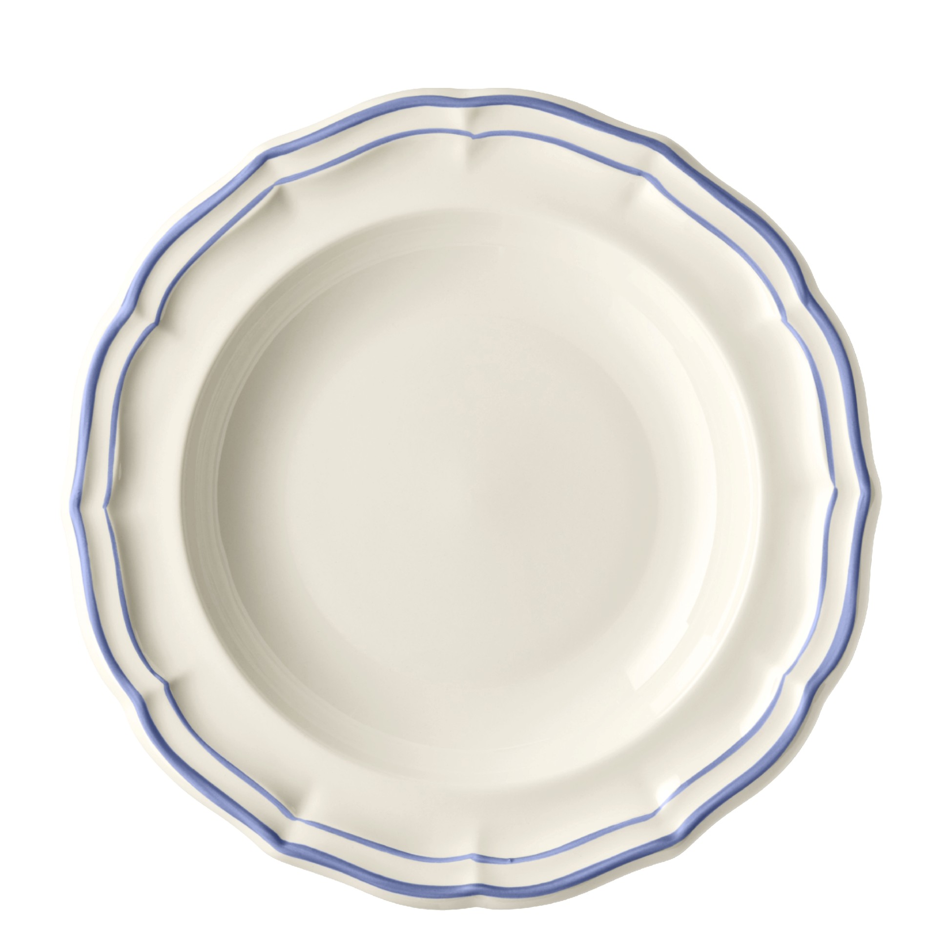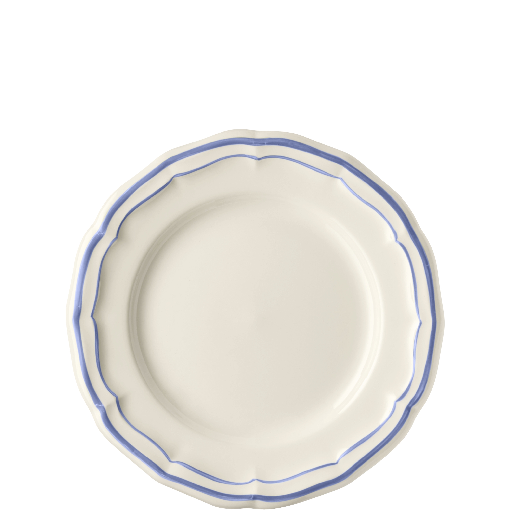 Die Geschirrserie Filet Bleu von Gien verkörpert den eleganten französischen Landhausstil.Der geschwungene Rand wird durch eine feine von Hand gemalte blaue Linie betont.Das Keramikgeschirr ist spülmaschinengeeignet.