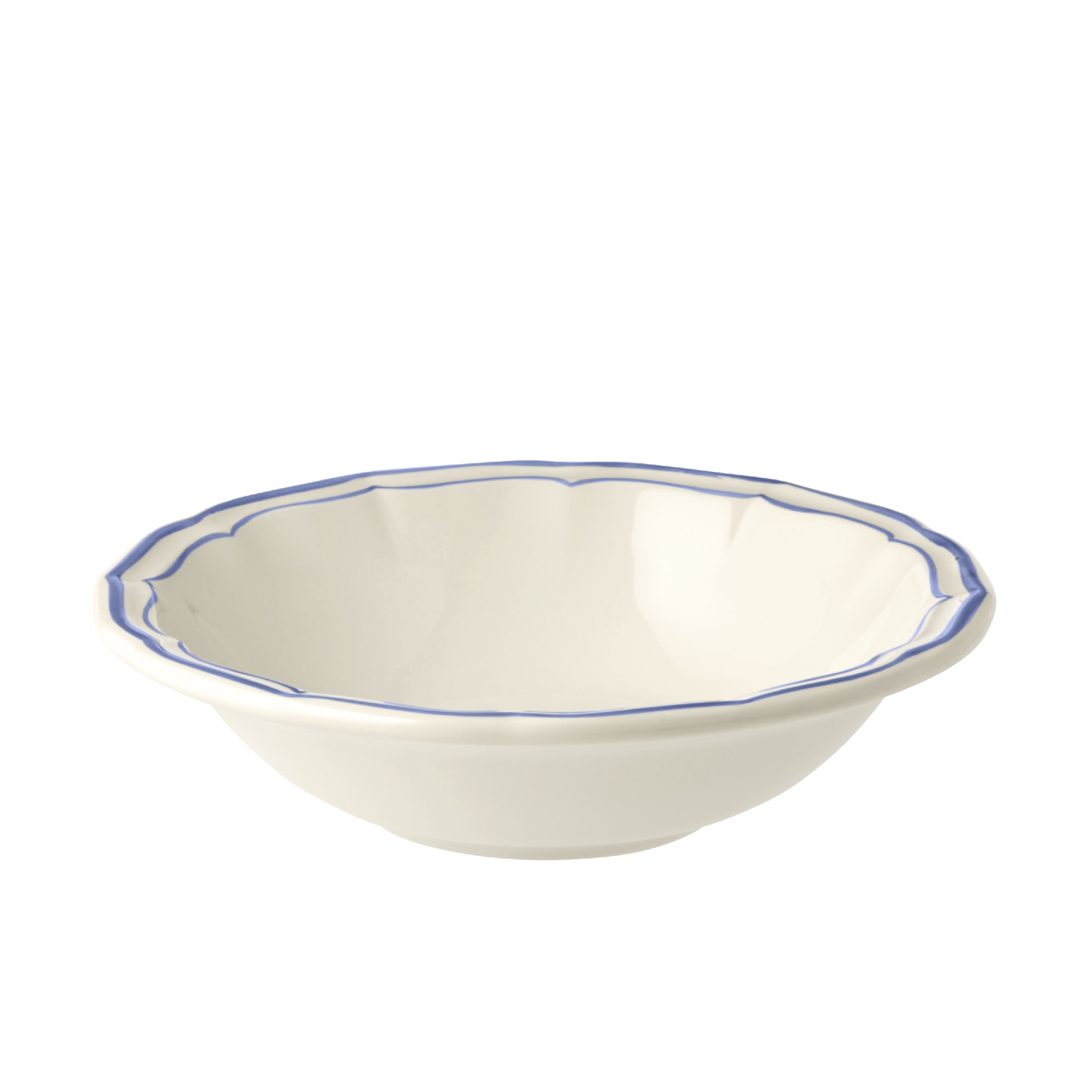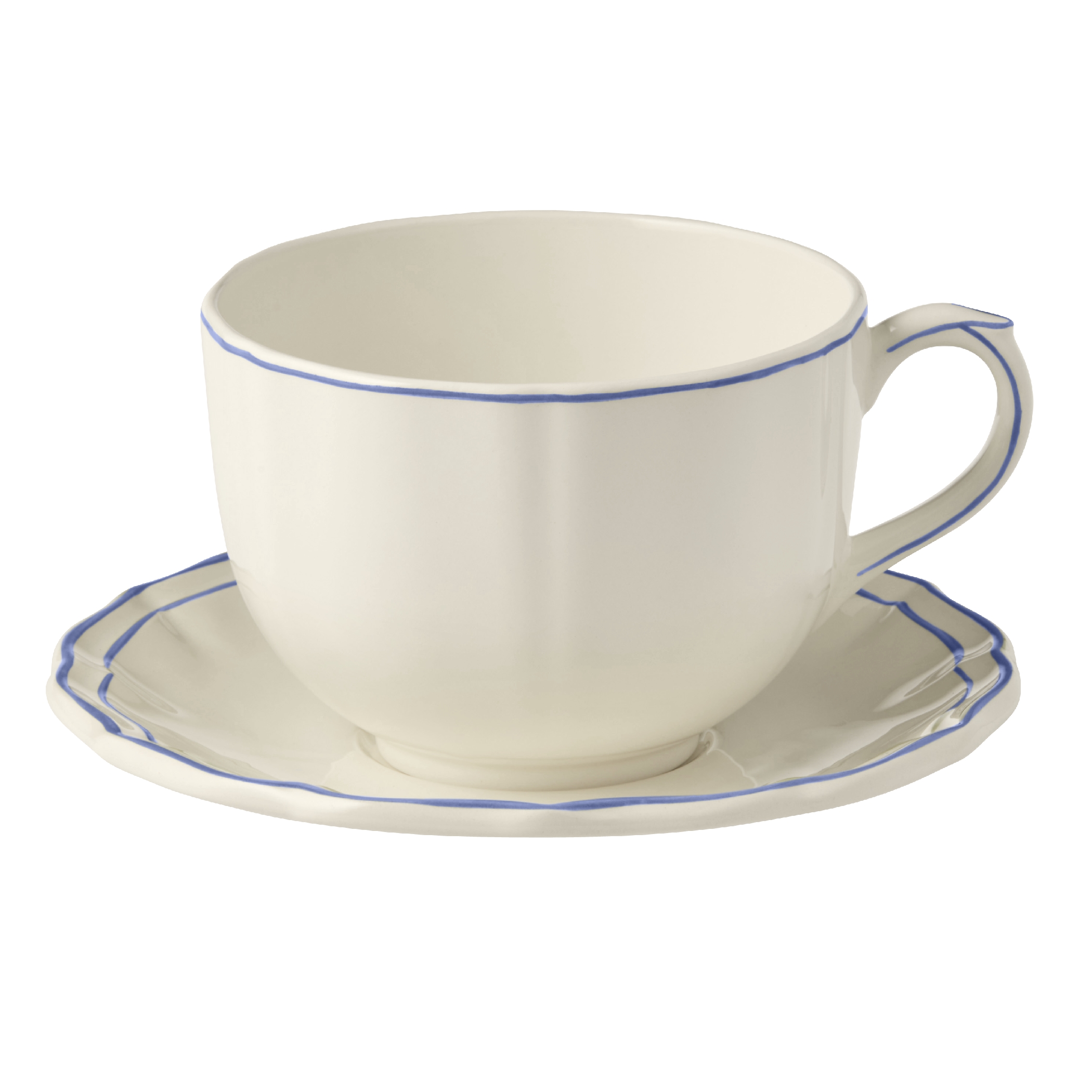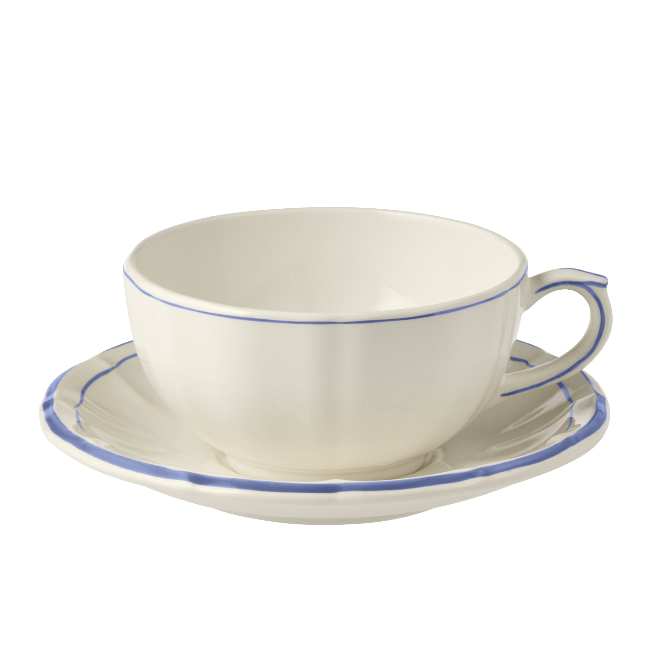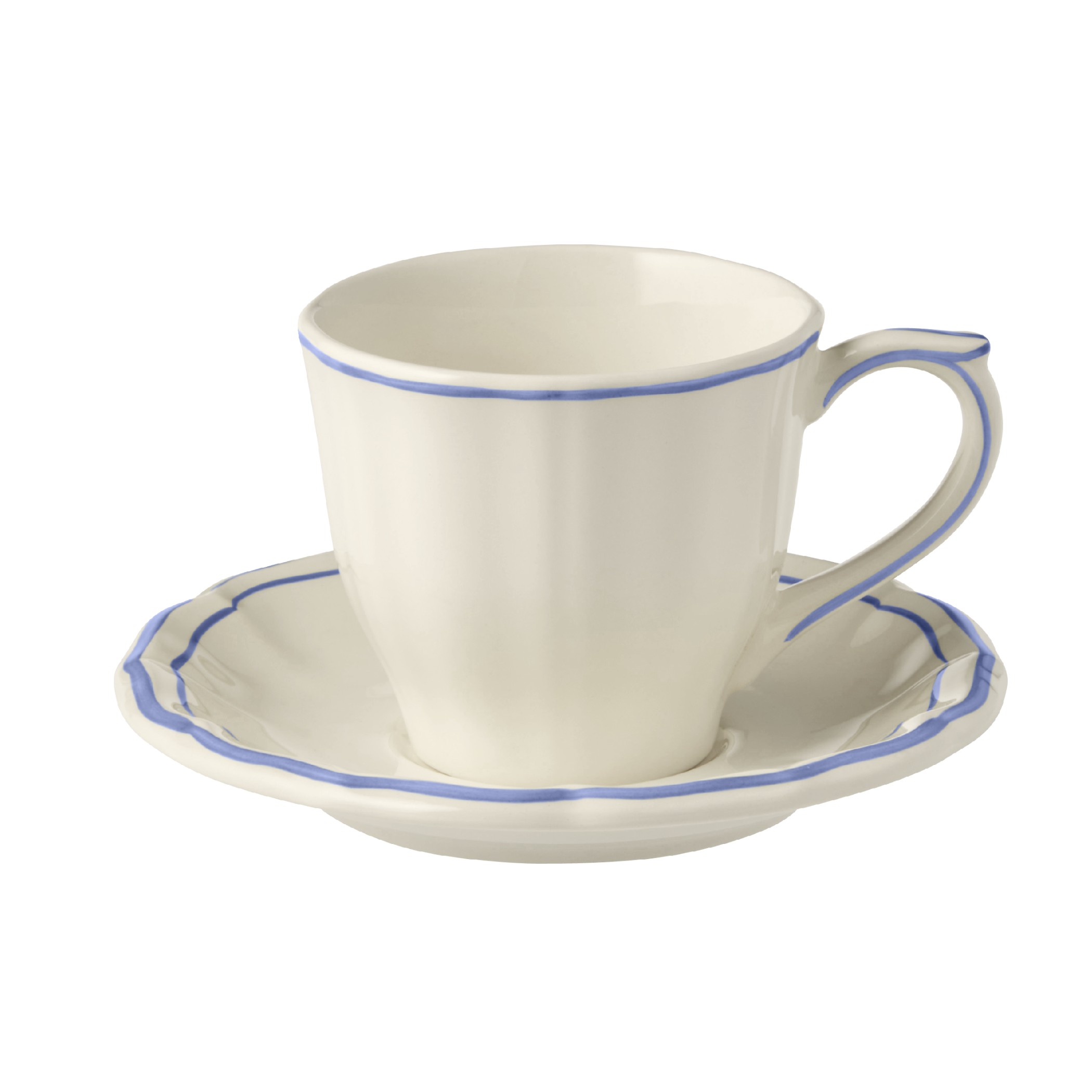Die Geschirrserie Filet Bleu von Gien verkörpert den eleganten französischen Landhausstil.Der geschwungene Rand wird durch eine feine von Hand gemalte blaue Linie betont.Das Keramikgeschirr ist spülmaschinengeeignet.