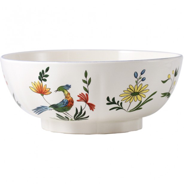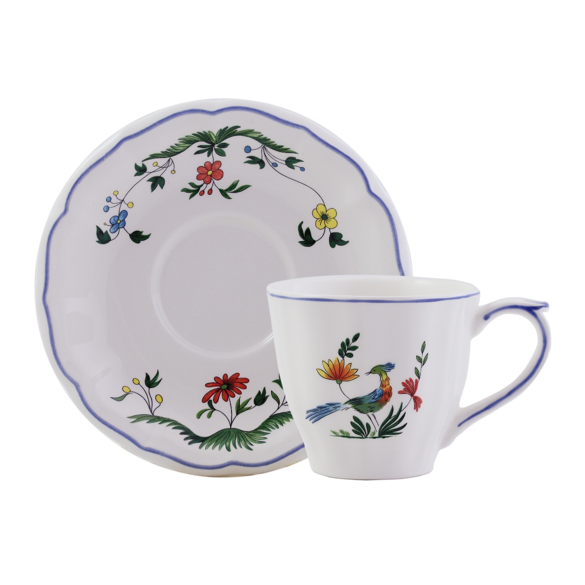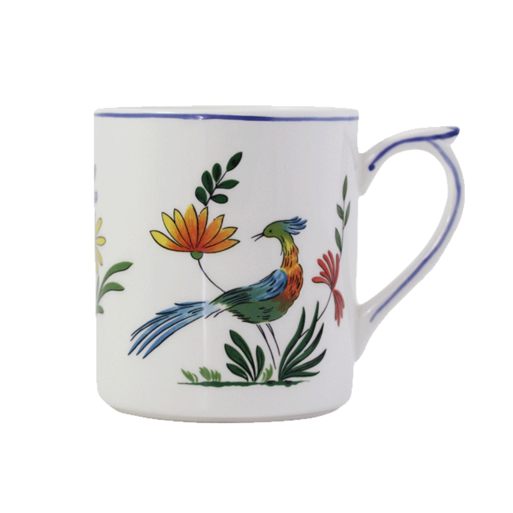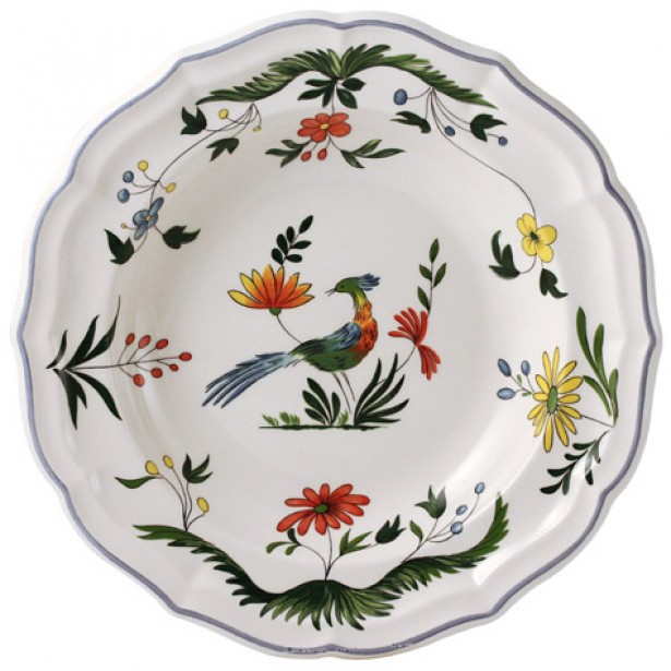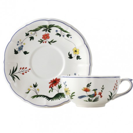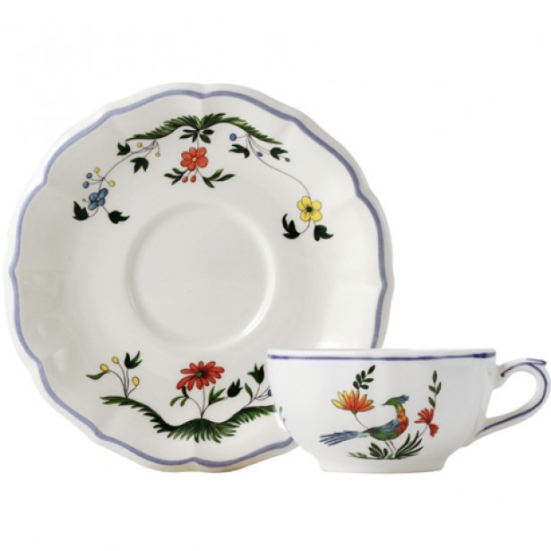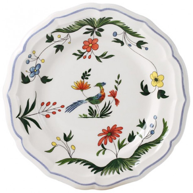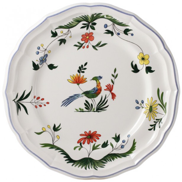 Das Geschirr Oiseaux de Paradis von Gien hat als zentrales Motiv Paradiesvögel umgeben von Blüten und Blättern.