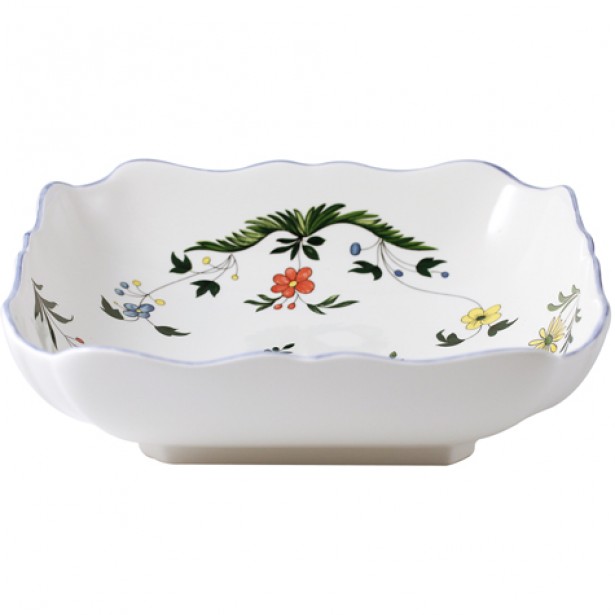 Der geschwungene Rand wird durch eine feine von Hand gemalte blaue Linie betont.