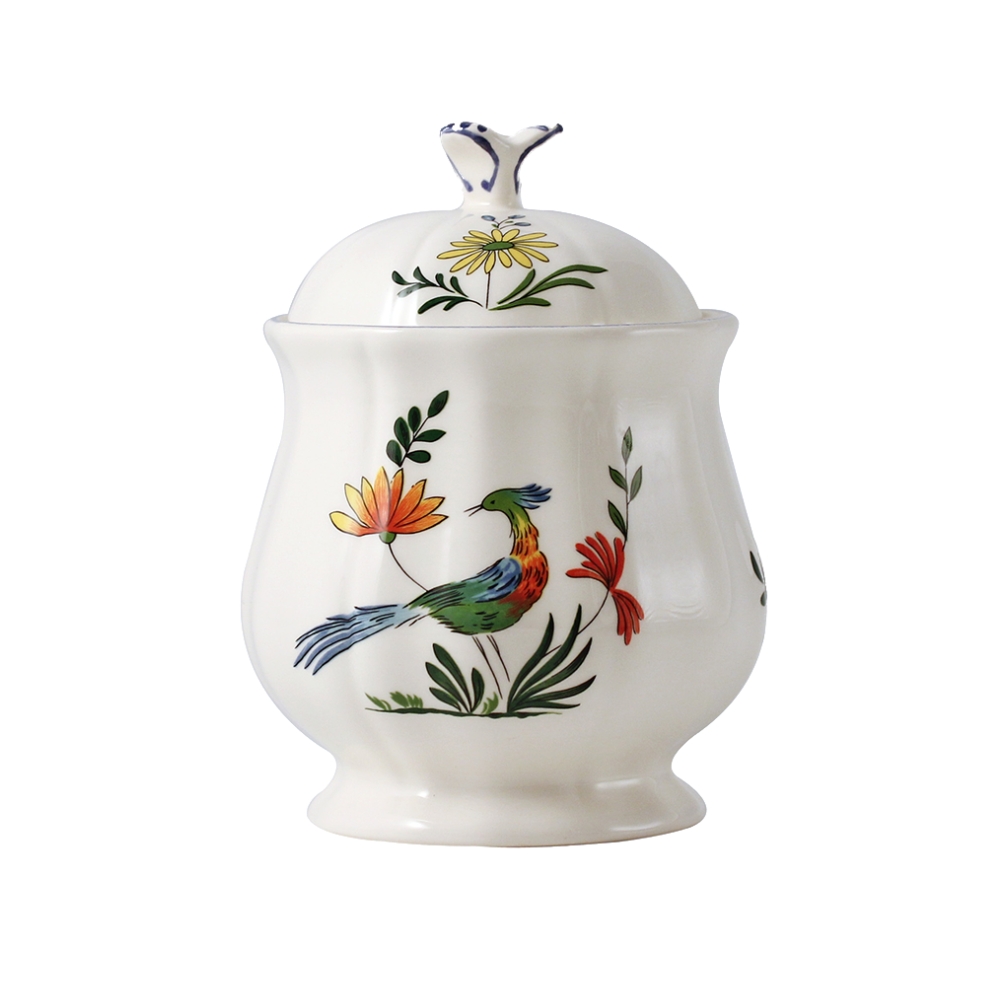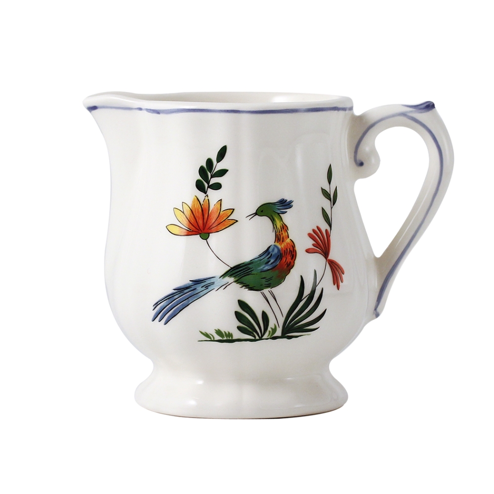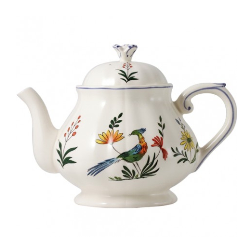 Das Geschirr Oiseaux de Paradis von Gien hat als zentrales Motiv Paradiesvögel umgeben von Blüten und Blättern.