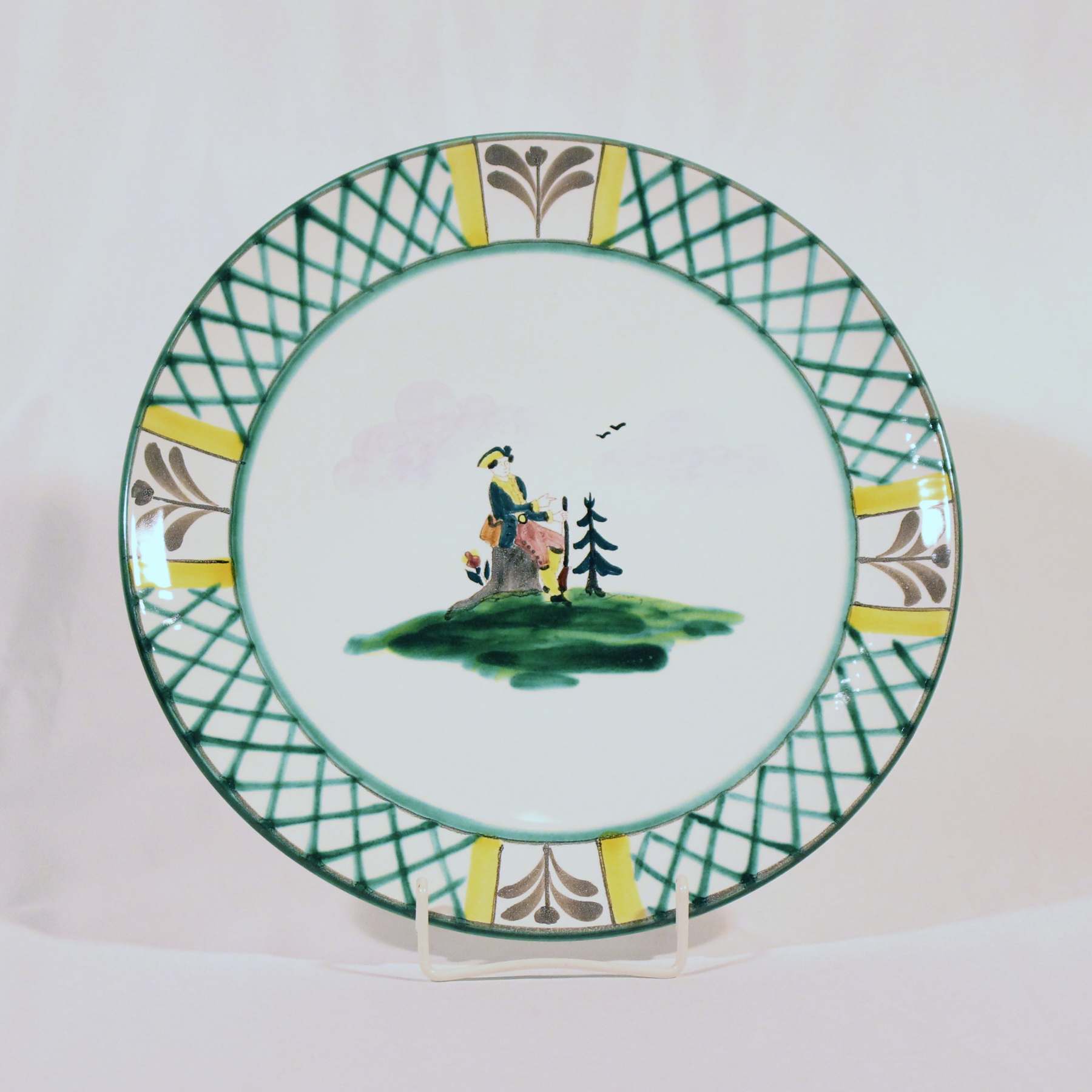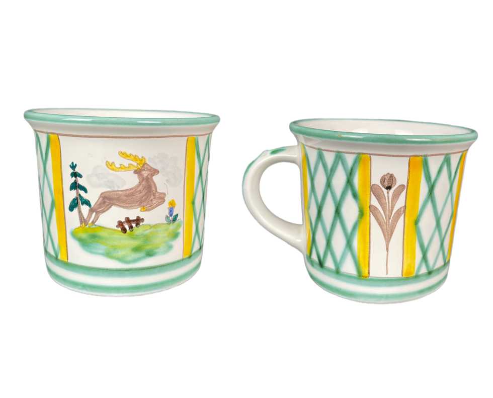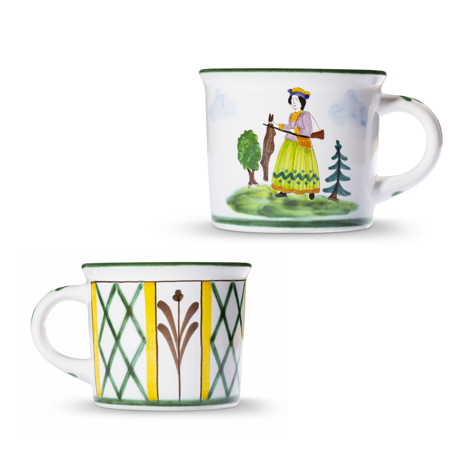 Die handgemalten Motive zeigen Jäger, Jägerin, Hirsch und Hund.