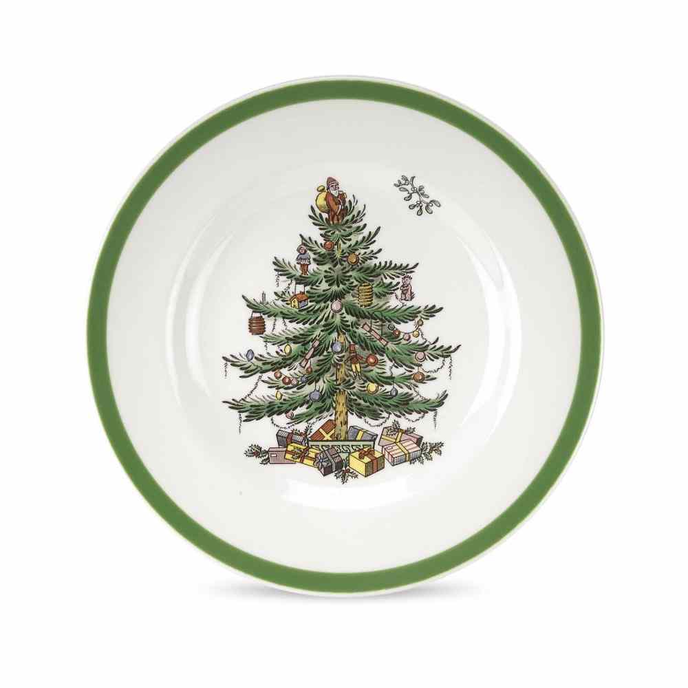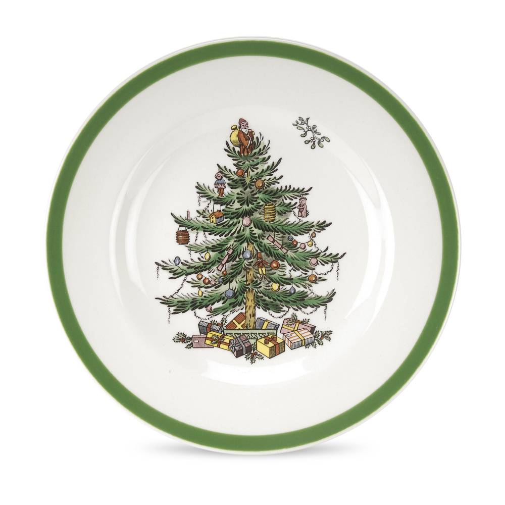 Das Motiv auf dem Hartsteingut zeigt einen klassisch geschmückten Weihnachtsbaum mit Geschenken. Mistel und Ilex gesellen sich dazu, grüne Ränder umrahmen das Dekor.
