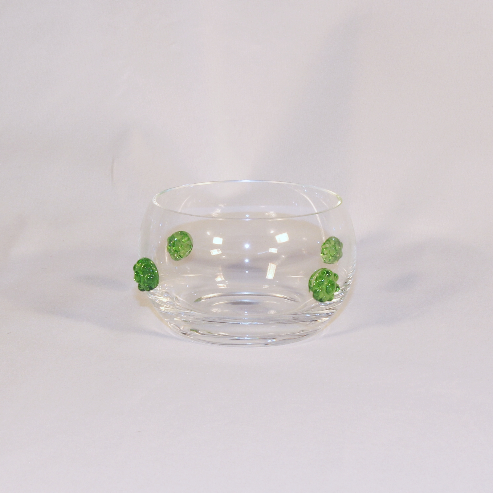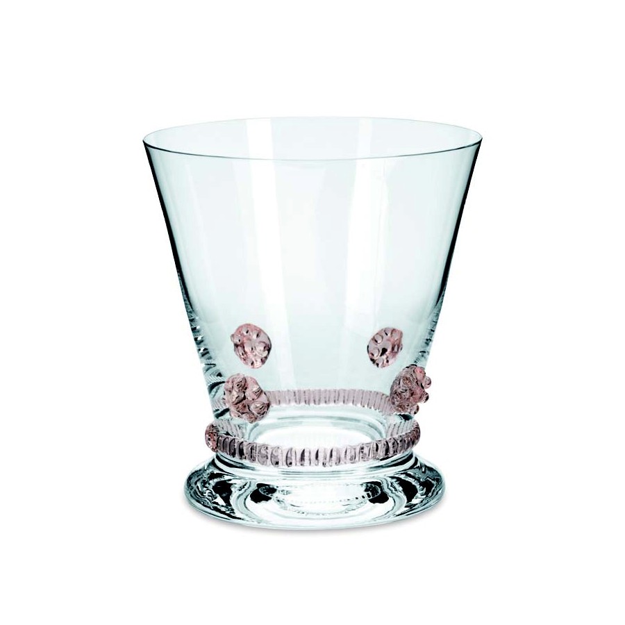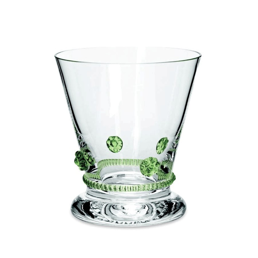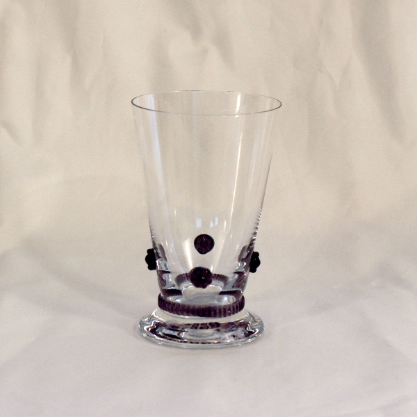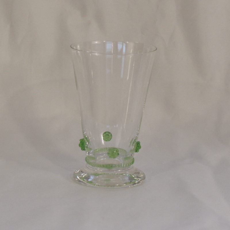 Die Kollektion Bacchus der Kirstallglasmanufaktur Theresienthal stammt aus der Feder von Henriette Steigerwald, ca. 1890. Die Applikationen lassen noch die Romantik der Gründerjahre erahnen. Das Spiel der Farben, die unaufdringliche Form und die Handlichkeit lassen das Alter der Serie vergessen und machen sie zeitlos schön. Die Rosetten und Radelbänder gibt es in den Farben: klar, hellblau, hellgrün, dunkelgrün, violett, rosé, bernstein und Restbestände in violett.