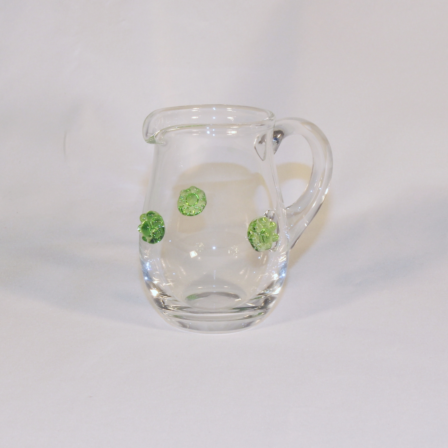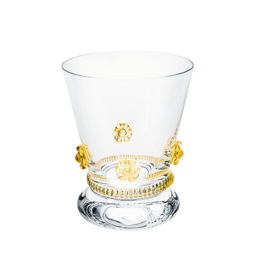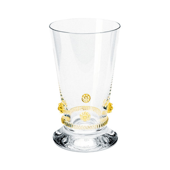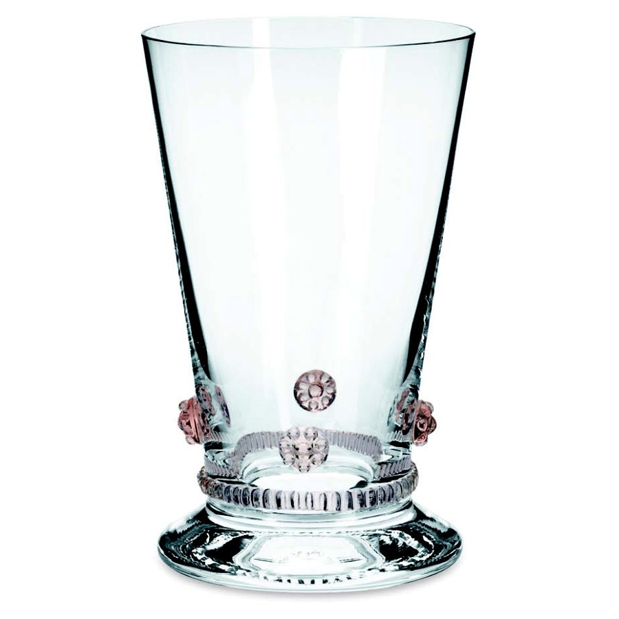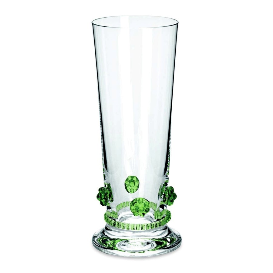 Die Kollektion Bacchus der Kirstallglasmanufaktur Theresienthal stammt aus der Feder von Henriette Steigerwald, ca. 1890. Die Applikationen lassen noch die Romantik der Gründerjahre erahnen. Das Spiel der Farben, die unaufdringliche Form und die Handlichkeit lassen das Alter der Serie vergessen und machen sie zeitlos schön. Die Rosetten und Radelbänder gibt es in den Farben: klar, hellblau, hellgrün, dunkelgrün, violett, rosé, bernstein und Restbestände in violett.