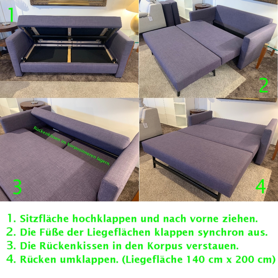 gelagert werden kann. Rücken und 2. Sitzfläche werden umgeklappt und die Liegefläche ist fertig.
